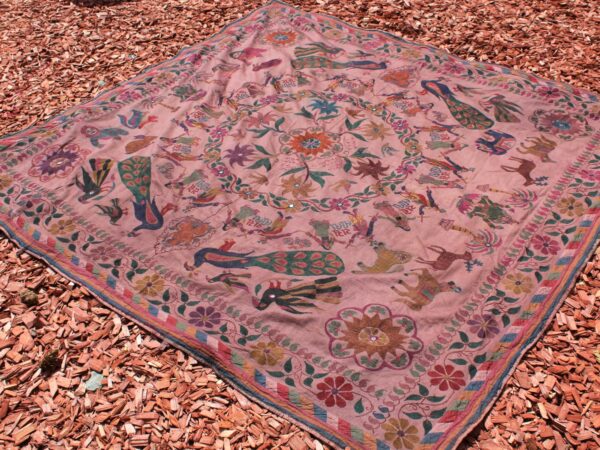 Unikalus, rankų darbo vintažinis gobelenas iš Indijos, pasižymintis patchwork dizainu ir gausiais siuvinėjimo raštais. Kiekvienas kvadratas dekoruotas skirtingais ornamentais, veidrodėliais ir tradiciniais motyvais, suteikiančiais autentiškumo bei rytietiško žavesio. Puikiai tinka kaip sienos dekoracija, lovatiesė, sofa užtiesalas ar interjero akcentas, kuris įneš į namus spalvų ir bohemiškos nuotaikos.