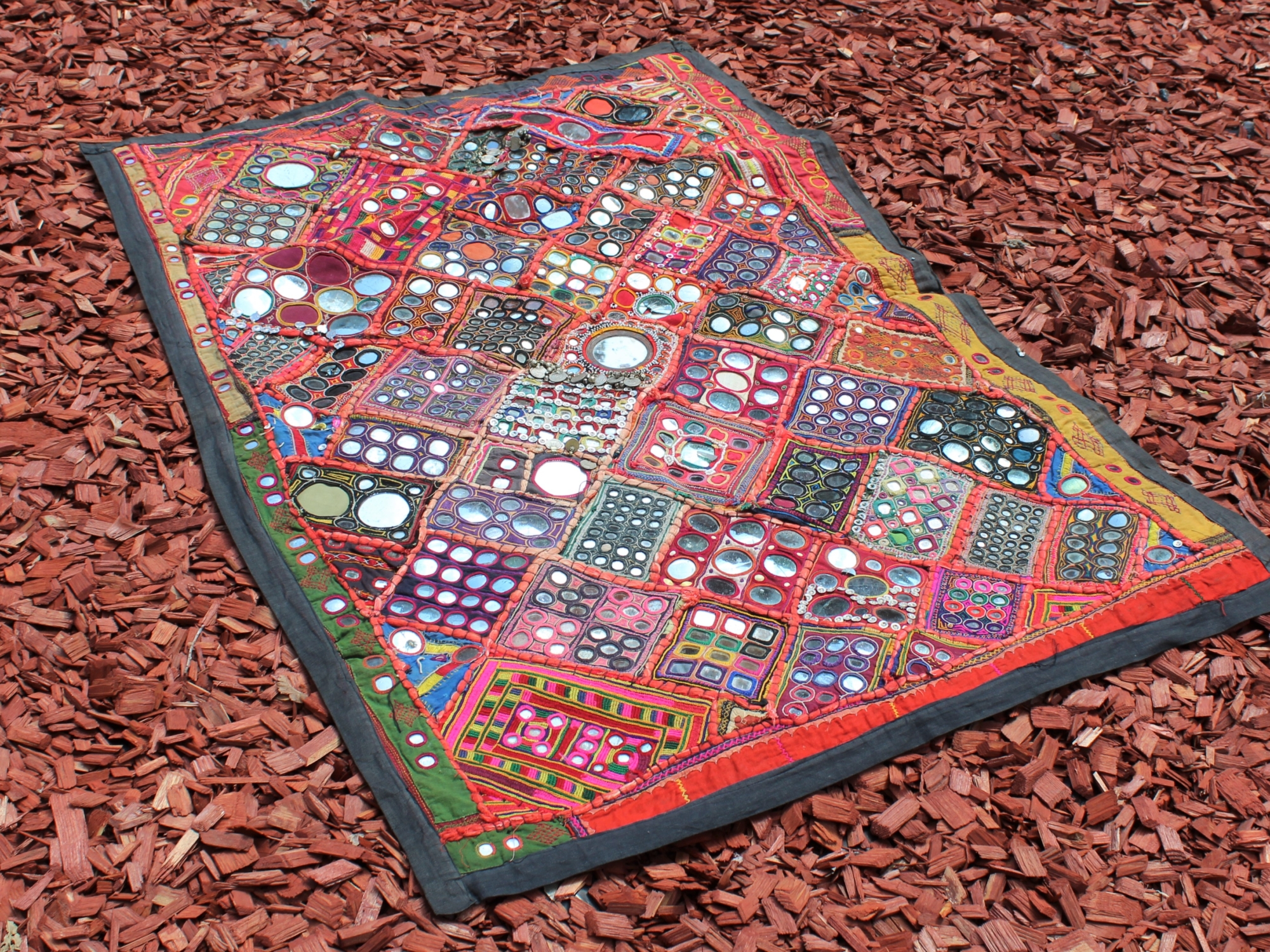 Unikalus, rankų darbo vintažinis gobelenas iš Indijos, pasižymintis patchwork dizainu ir gausiais siuvinėjimo raštais. Kiekvienas kvadratas dekoruotas skirtingais ornamentais, veidrodėliais ir tradiciniais motyvais, suteikiančiais autentiškumo bei rytietiško žavesio. Puikiai tinka kaip sienos dekoracija, lovatiesė, sofa užtiesalas ar interjero akcentas, kuris įneš į namus spalvų ir bohemiškos nuotaikos.