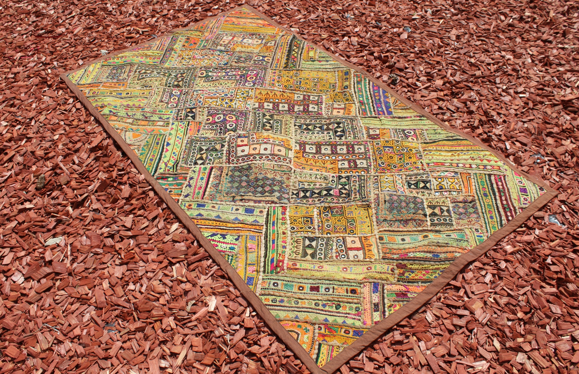 Unikalus, rankų darbo vintažinis gobelenas iš Indijos, pasižymintis spalvingu patchwork dizainu ir gausiais siuvinėjimo raštais. Kiekvienas kvadratas dekoruotas skirtingais ornamentais, veidrodėliais ir tradiciniais motyvais, suteikiančiais autentiškumo bei rytietiško žavesio. Puikiai tinka kaip sienos dekoracija, lovatiesė, sofa užtiesalas ar interjero akcentas, kuris įneš į namus spalvų ir bohemiškos nuotaikos.