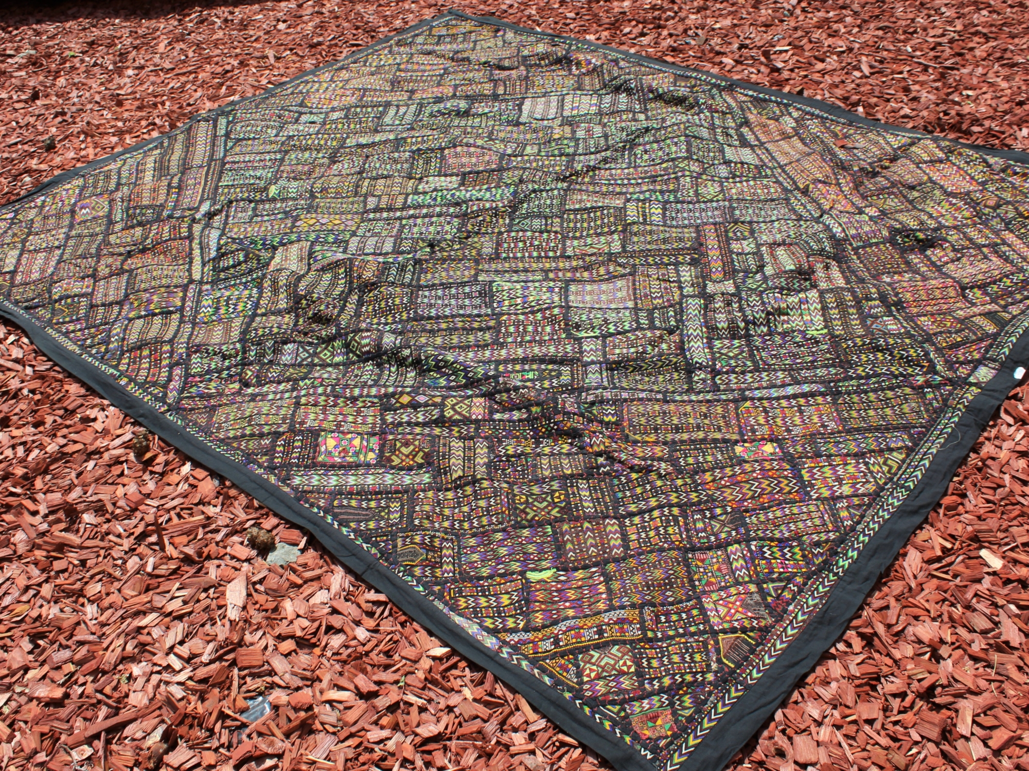 Unikalus, rankų darbo vintažinis gobelenas iš Indijos, pasižymintis patchwork dizainu ir gausiais siuvinėjimo raštais. Kiekvienas kvadratas dekoruotas skirtingais ornamentais, veidrodėliais ir tradiciniais motyvais, suteikiančiais autentiškumo bei rytietiško žavesio. Puikiai tinka kaip sienos dekoracija, lovatiesė, sofa užtiesalas ar interjero akcentas, kuris įneš į namus spalvų ir bohemiškos nuotaikos.