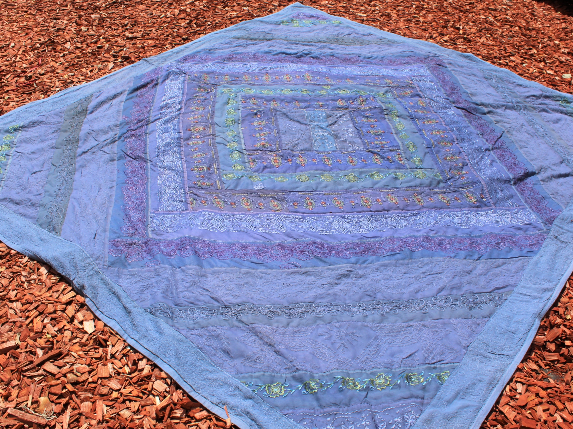 Unikalus, rankų darbo vintažinis gobelenas iš Indijos, pasižymintis patchwork dizainu ir gausiais siuvinėjimo raštais. Kiekvienas kvadratas dekoruotas skirtingais ornamentais, veidrodėliais ir tradiciniais motyvais, suteikiančiais autentiškumo bei rytietiško žavesio. Puikiai tinka kaip sienos dekoracija, lovatiesė, sofa užtiesalas ar interjero akcentas, kuris įneš į namus spalvų ir bohemiškos nuotaikos.