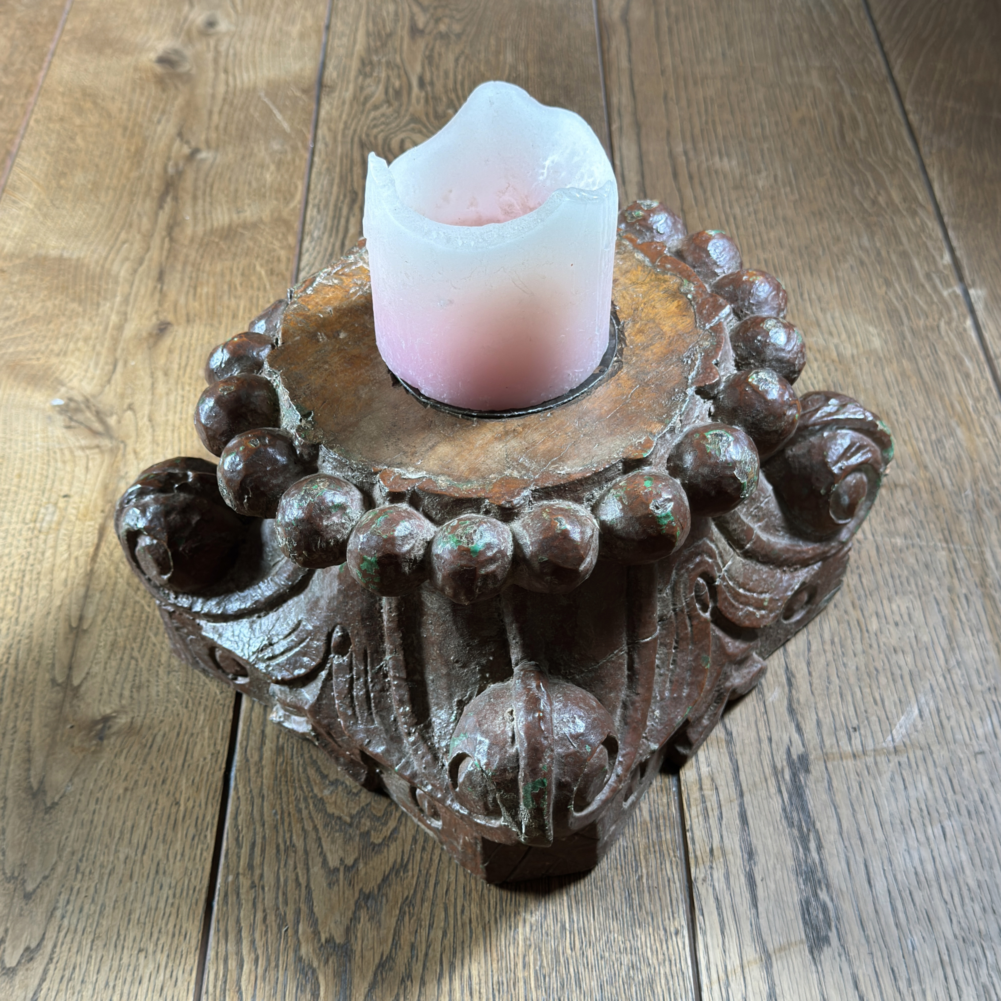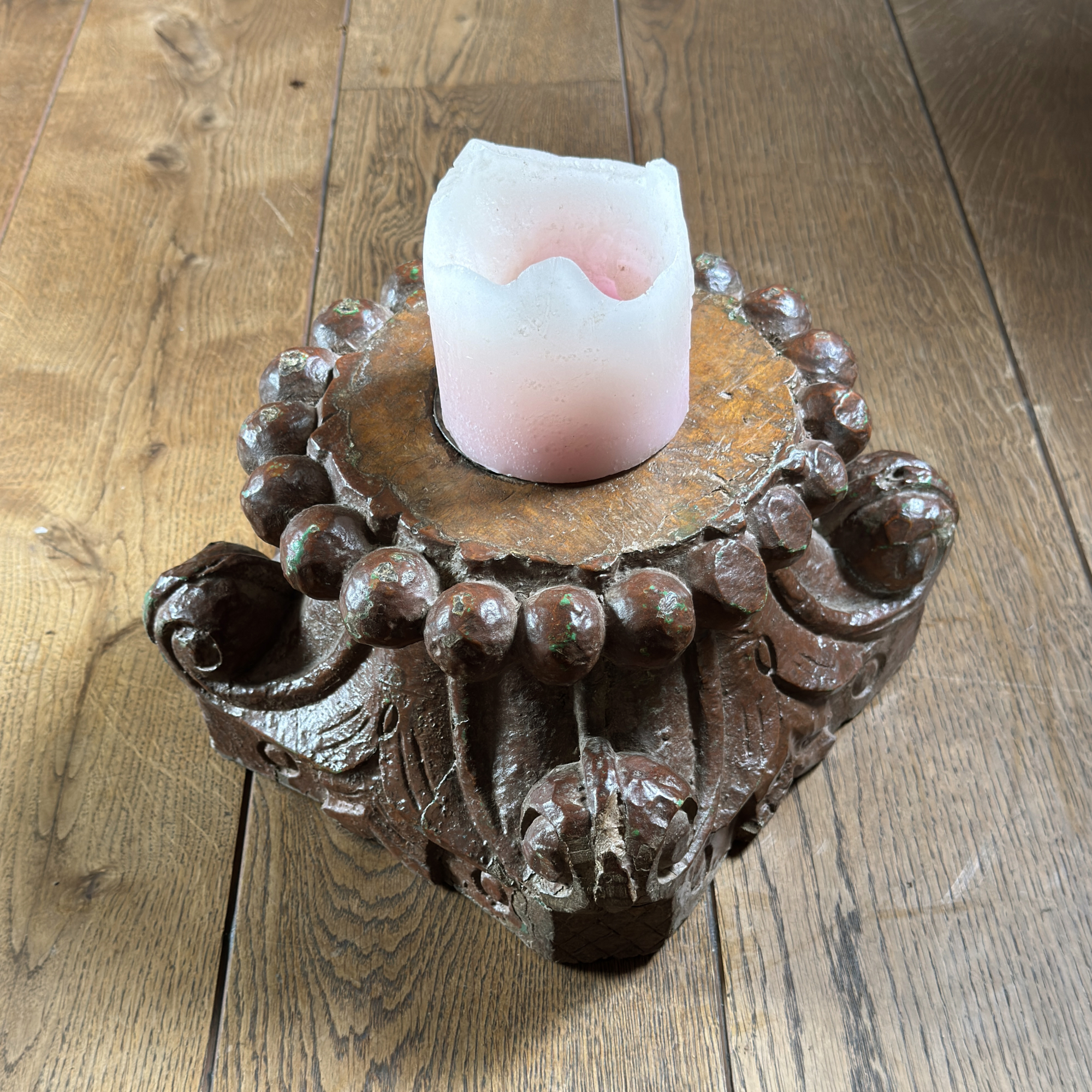 Medinė žvakidė pagaminta iš antikvarinės kolonos bazės.