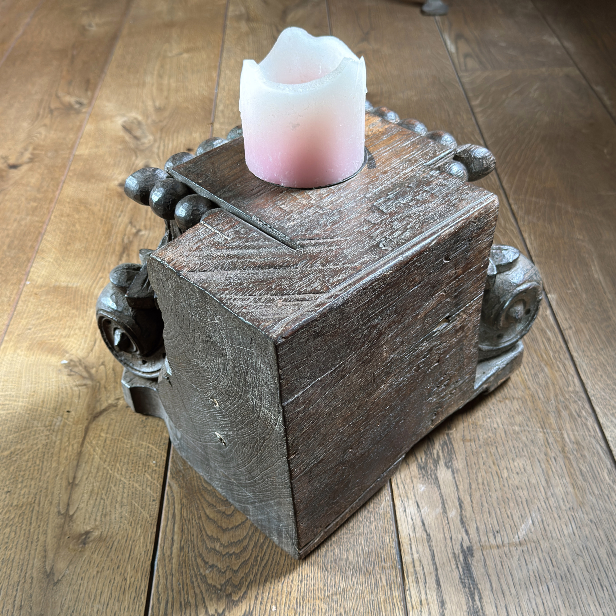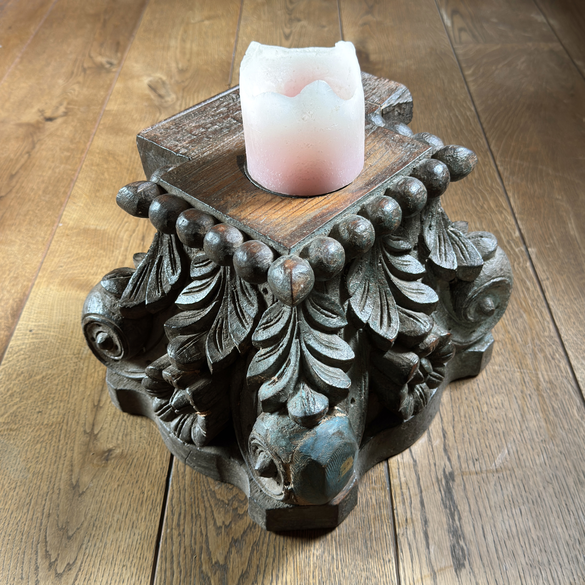 Medinė žvakidė pagaminta iš antikvarinės kolonos bazės.