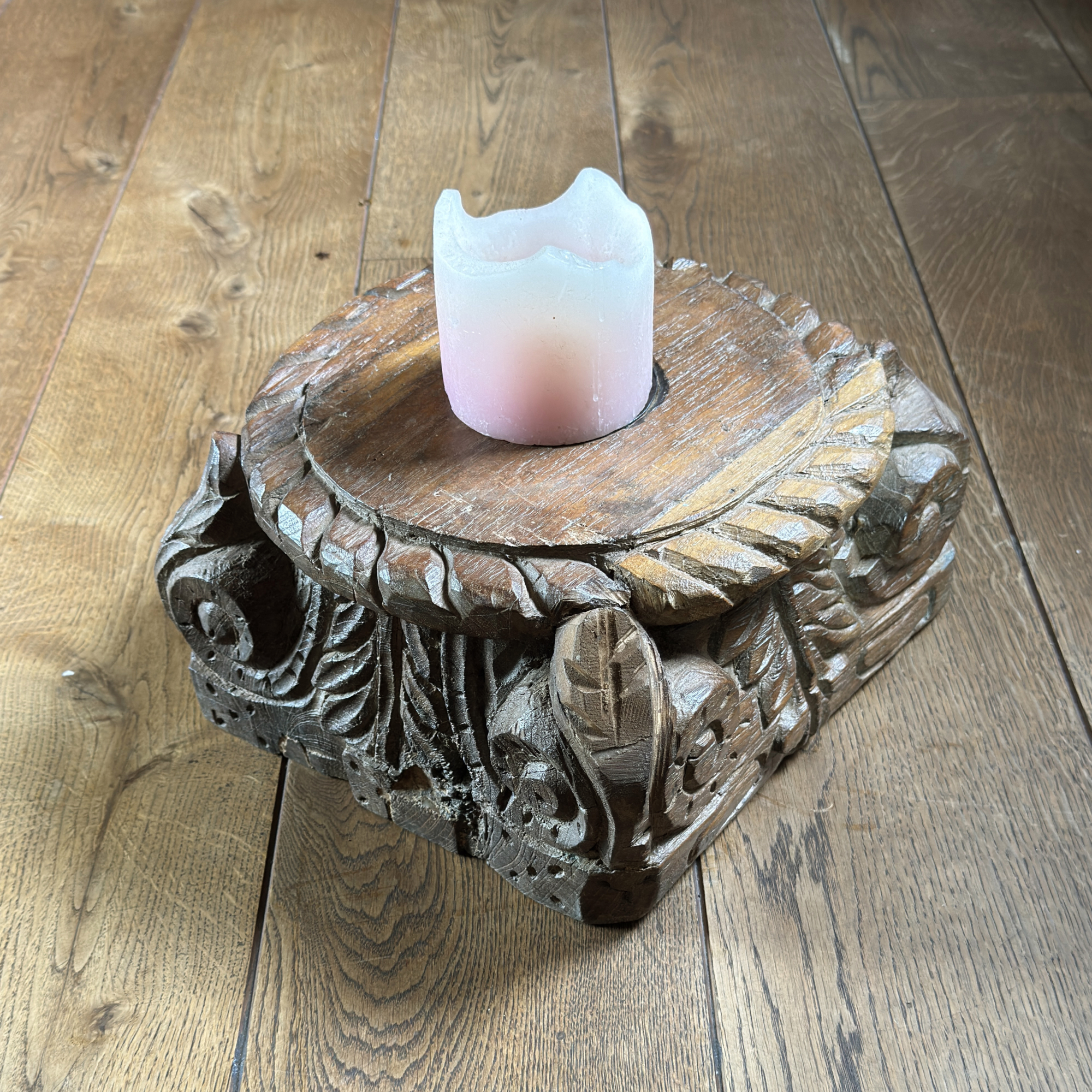 Medinė žvakidė pagaminta iš antikvarinės kolonos bazės.