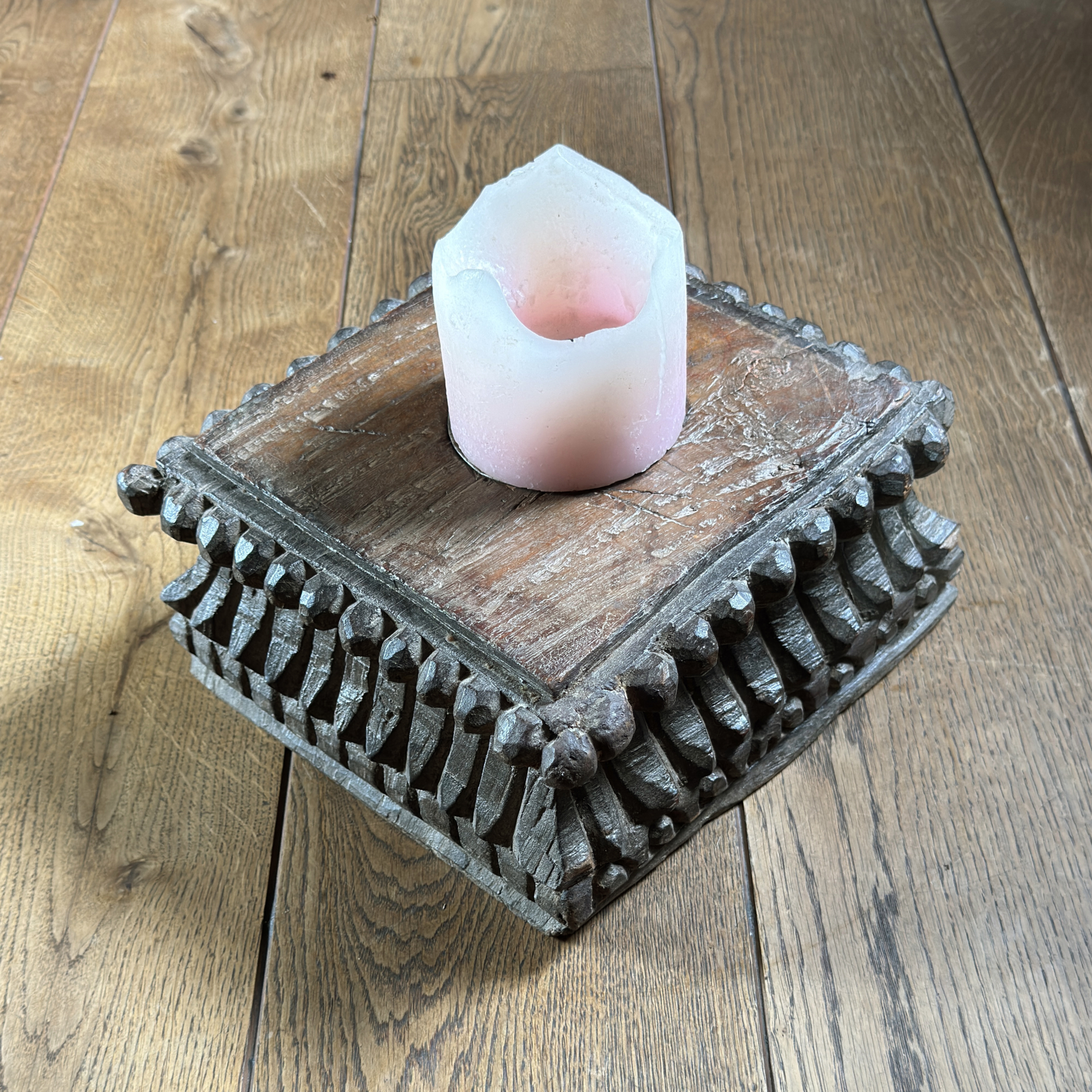Medinė žvakidė pagaminta iš antikvarinės kolonos bazės.