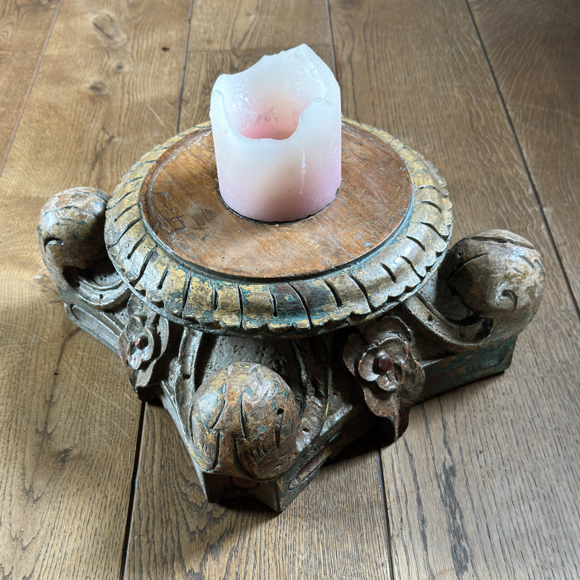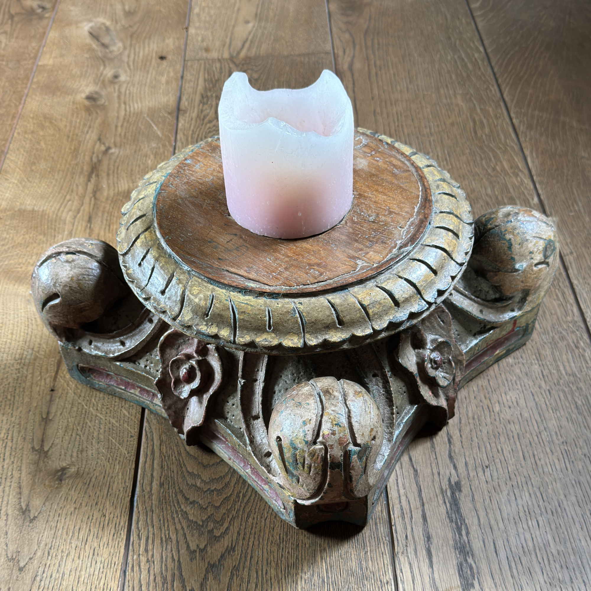 Medinė žvakidė pagaminta iš antikvarinės kolonos bazės.