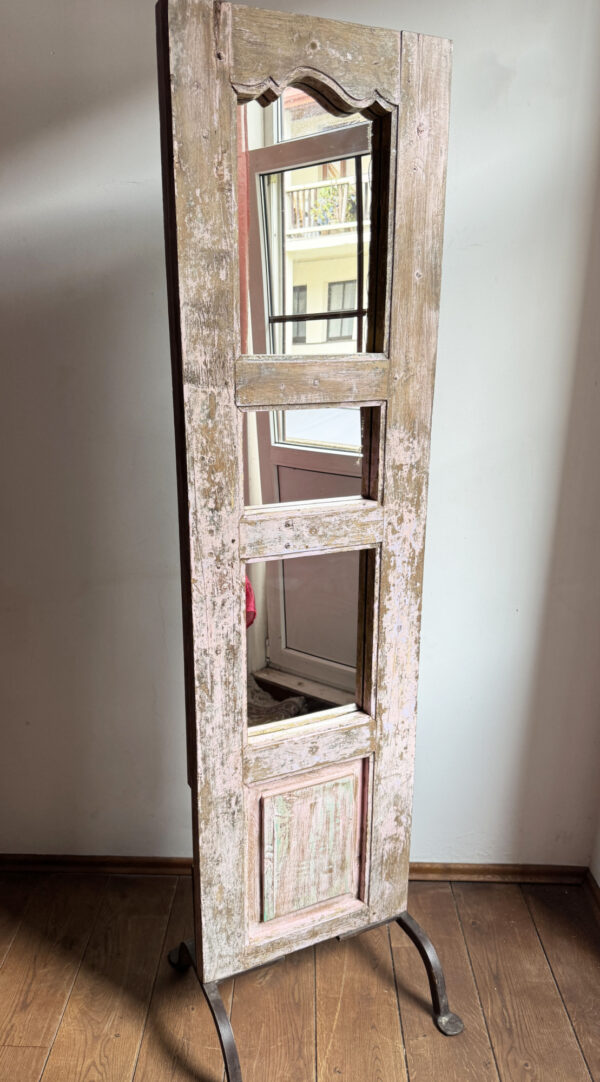 Pastatomas veidrodis pagamintas iš vintažinių durų rėmo.