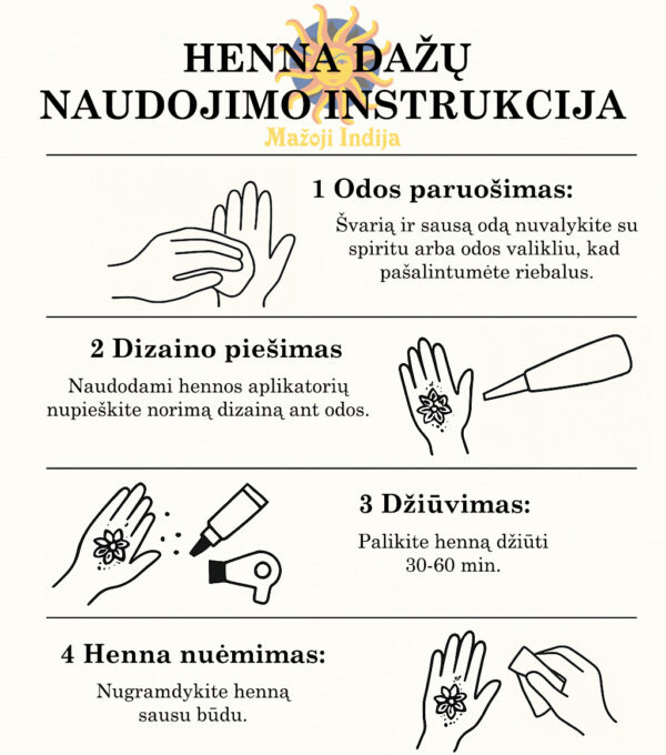„Henna“ dažai nesukelia alergijos, yra pagaminti iš natūralių medžiagų, todėl nekenkia odai. Be cheminių elementų.