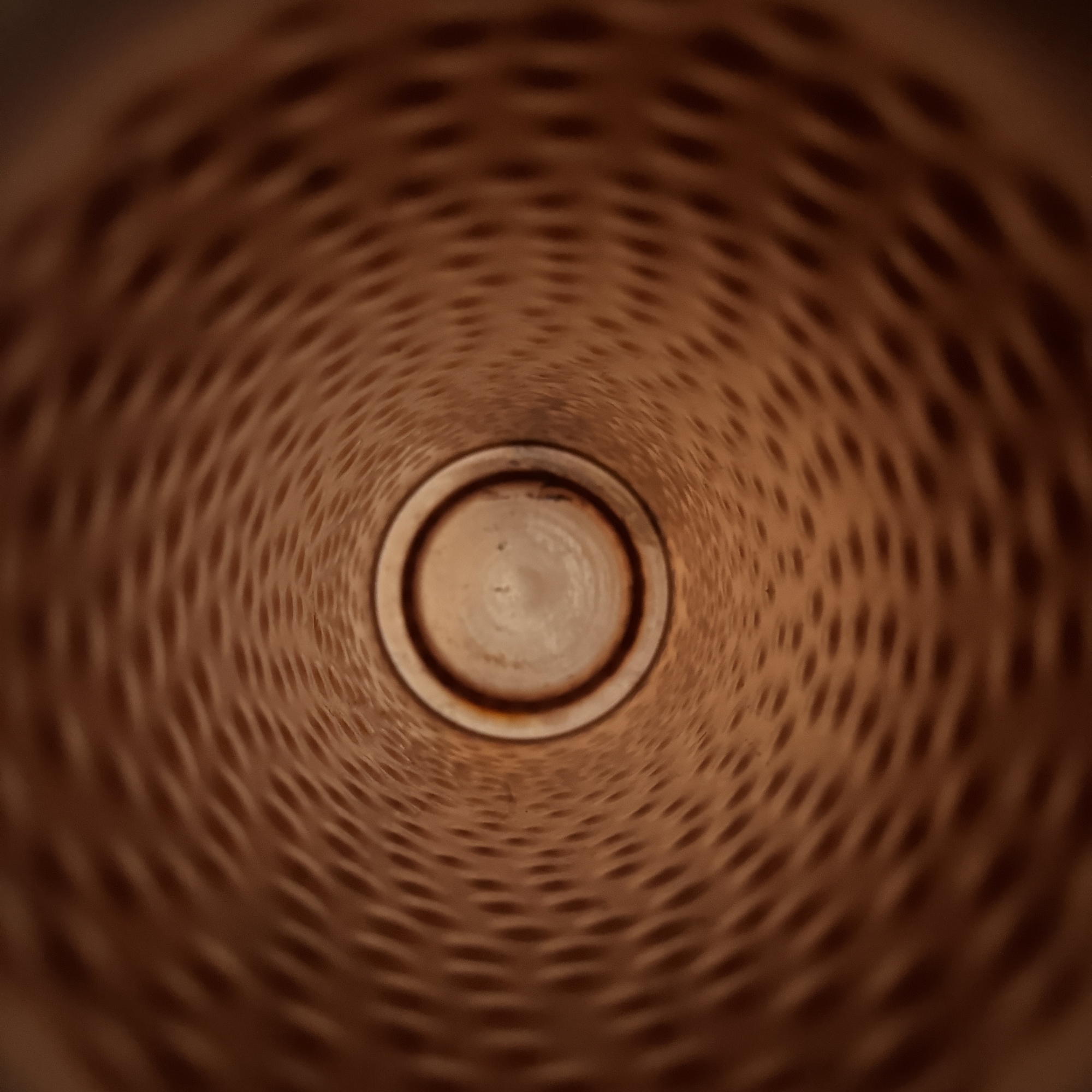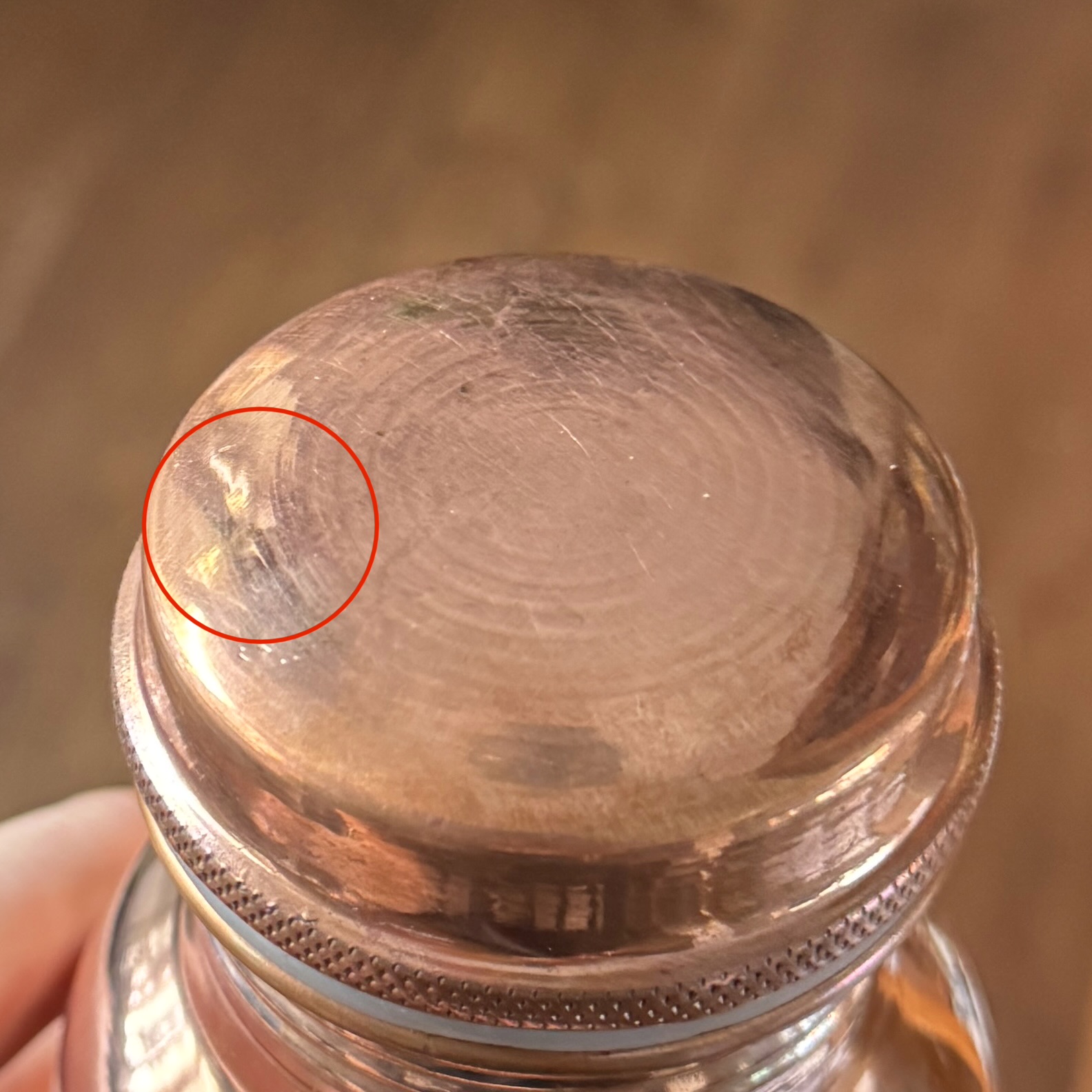 Defektas: smulkus įlenkimas kamštelyje, nenupoliruotas vidus. Matomi antroje ir trečioje nuotraukose. Užsisuka gerai.