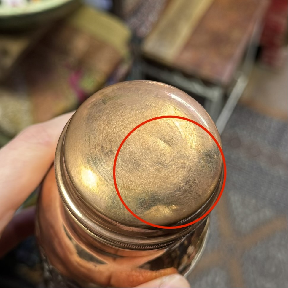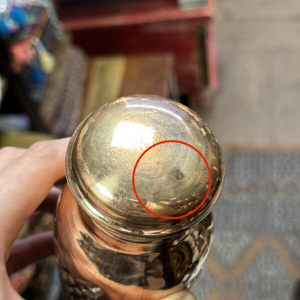 Defektas: smulkūs įlenkimai kamštelyje. Matomi antroje nuotraukoje. Užsisuka gerai.