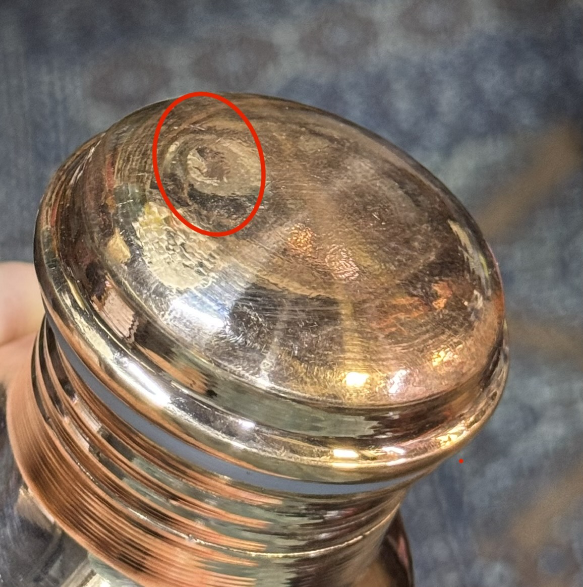 Defektas: įlenkimas kamštelyje ir krašte. Matomi antroje ir trečioje nuotraukose. Užsisuka gerai.