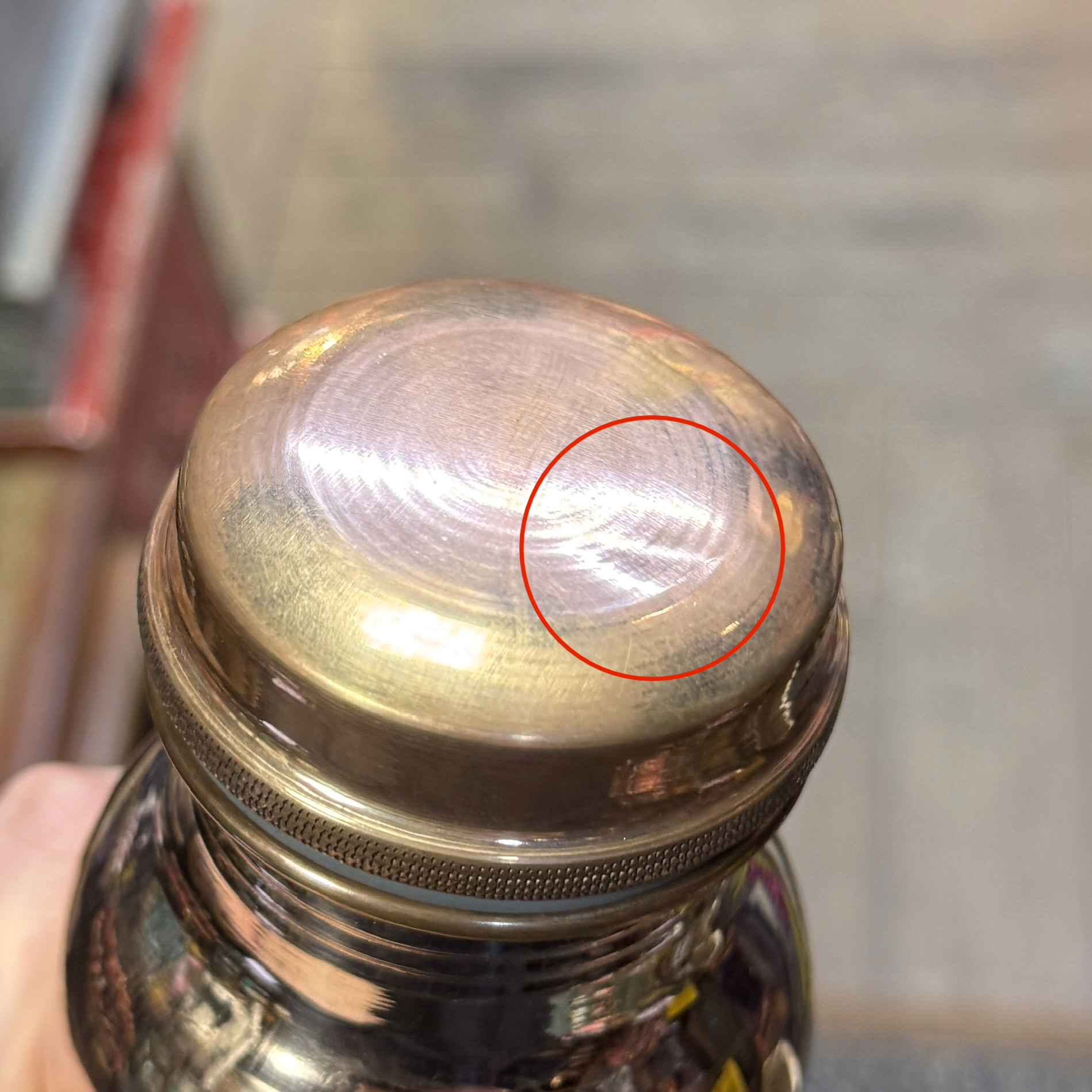 Defektas: smulkus įlenkimas kamštelyje. Matomas antroje nuotraukoje. Užsisuka gerai.