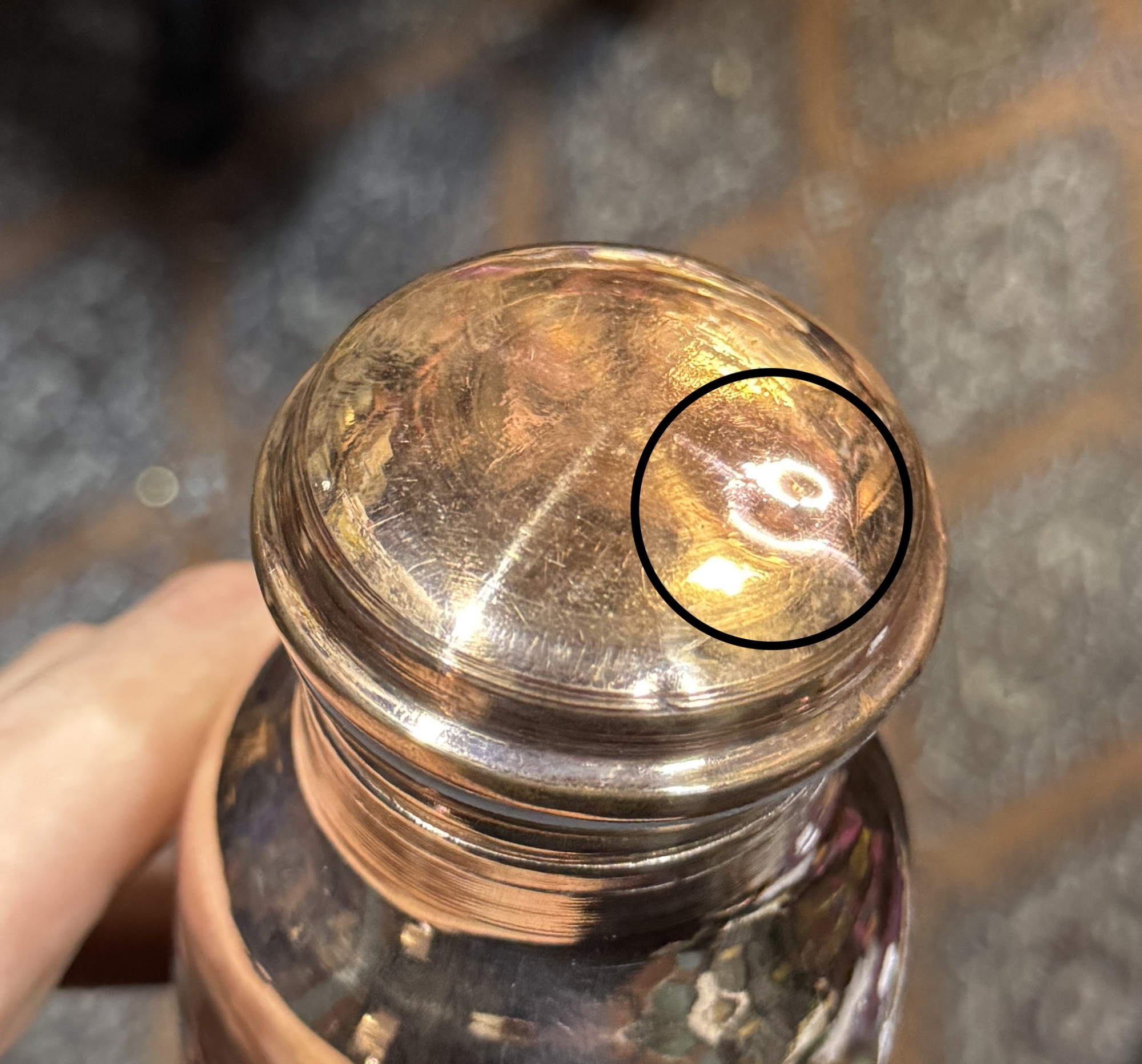 Defektas: smulkus įlenkimas gertuvės kamštelyje, nenupoliruotas vidus. Matomi antroje ir trečioje nuotraukose. Užsisuka gerai.
